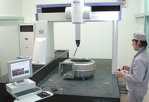 高精度の三次元測定器により、μmm単位で製品の寸法を検査しています。 ・2007年3月 導入 ・測定範囲(X軸 × Y軸 × Z軸):1,205 × 2,005 × 1,005 mm ・最大許容指示誤差:(2.3+3L/1,000)μm[L=任意測定長(mm)] |